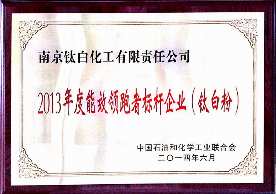2014年6月25日,中国石油和化学工业联合会组织召开了2013年度石油和化工行业重点耗能产品能效领跑者发布会,对原油加工、乙烯、合成氨、甲醇、电石、烧碱、聚氯乙烯、纯碱、轮胎、炭黑、黄磷、磷酸一铵、磷酸二铵、硫酸、钛白粉、氧化铁系颜料等16个产品能效领跑者标杆企业及指标予以发布。南京钛白化工有限责任公司“锐钛型钛白粉”产品单位产品综合能耗(825千克标准煤/吨)处于行业最低,喜获殊荣。